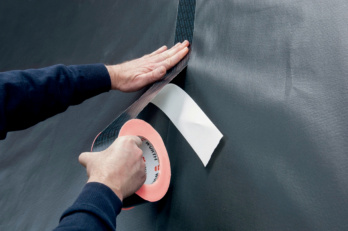 Fix Eurasol Max to the overlap seam by removing just a few centimetres of the masking paper. Pulling off the masking paper bonds the adhesive tape over the entire length by pressing it on. Please ensure sufficient contact pressure. After adhesion, cut the adhesive tape with a knife. The application surface must be dry and free from grease, chips and dust. Ensure that no standing water can build up within the bonded area. Do not subject the adhered tape to long-term tension.